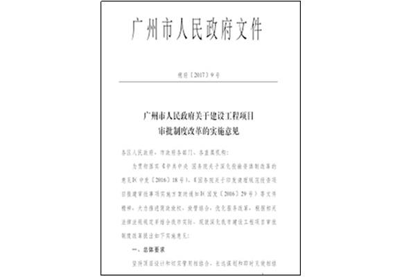 項目亮點 《廣州市建設工程項目審批制度改革的實施意見》已于2017年由廣州市政府印發(fā)實施。該文件落實中央有關文件精神,推進簡政放權,放管結合,優(yōu)化服務改革。改善企業(yè)投資建設工程項目審批管理、強化政府投資建設工程項目全流程管理、推進審批體制機制改革創(chuàng)新。